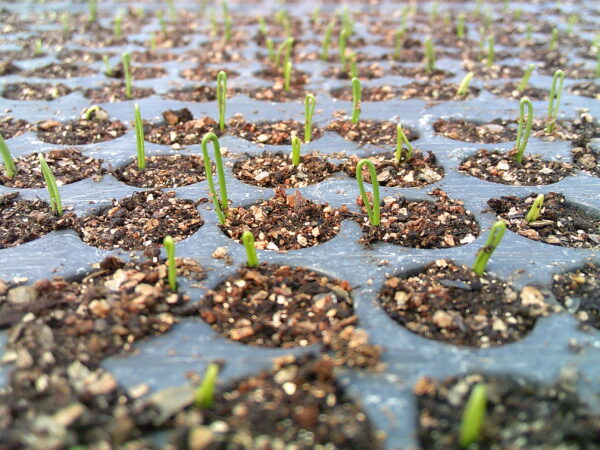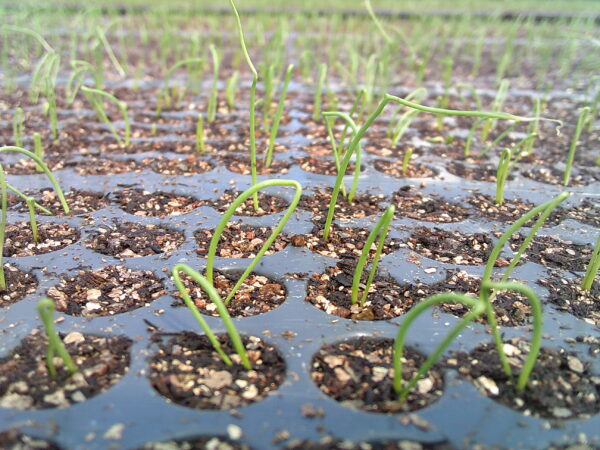 ヘアピンみたいなかたちで芽を出す玉ネギ苗。あとから真っすぐに伸びてくる姿がかわいいです。