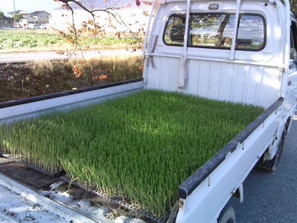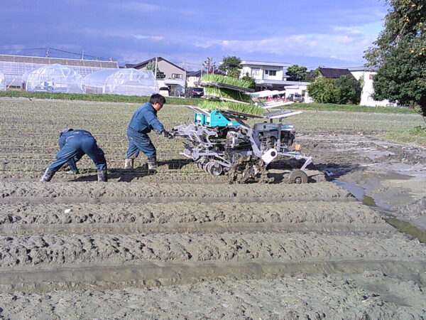 機械で植えていくのですが、なかなか大変でして。動かすの重たいし、ちゃんと植えられてない子は後から手で植えてます。一日やると腰が痛いっす。