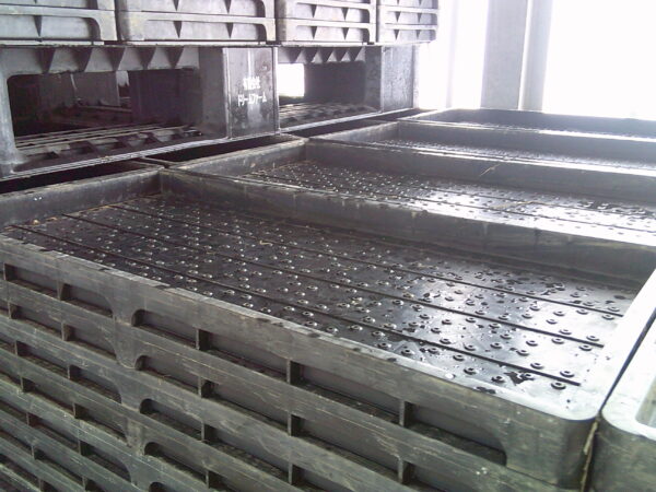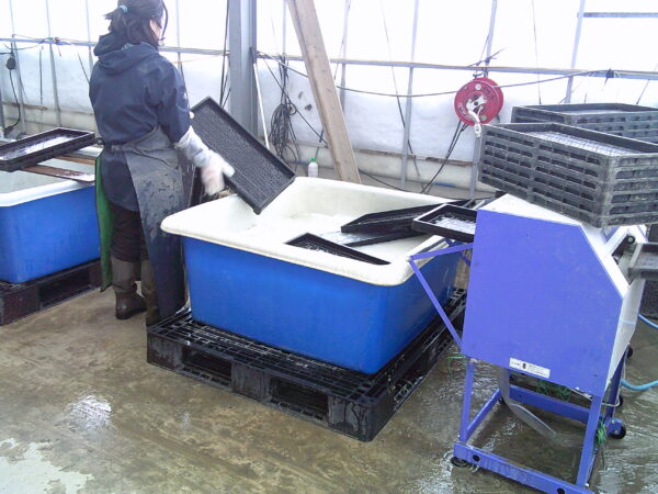 春はまだ先ですが、水稲育苗のための苗箱は一枚ずつ洗浄、消毒しておきます。